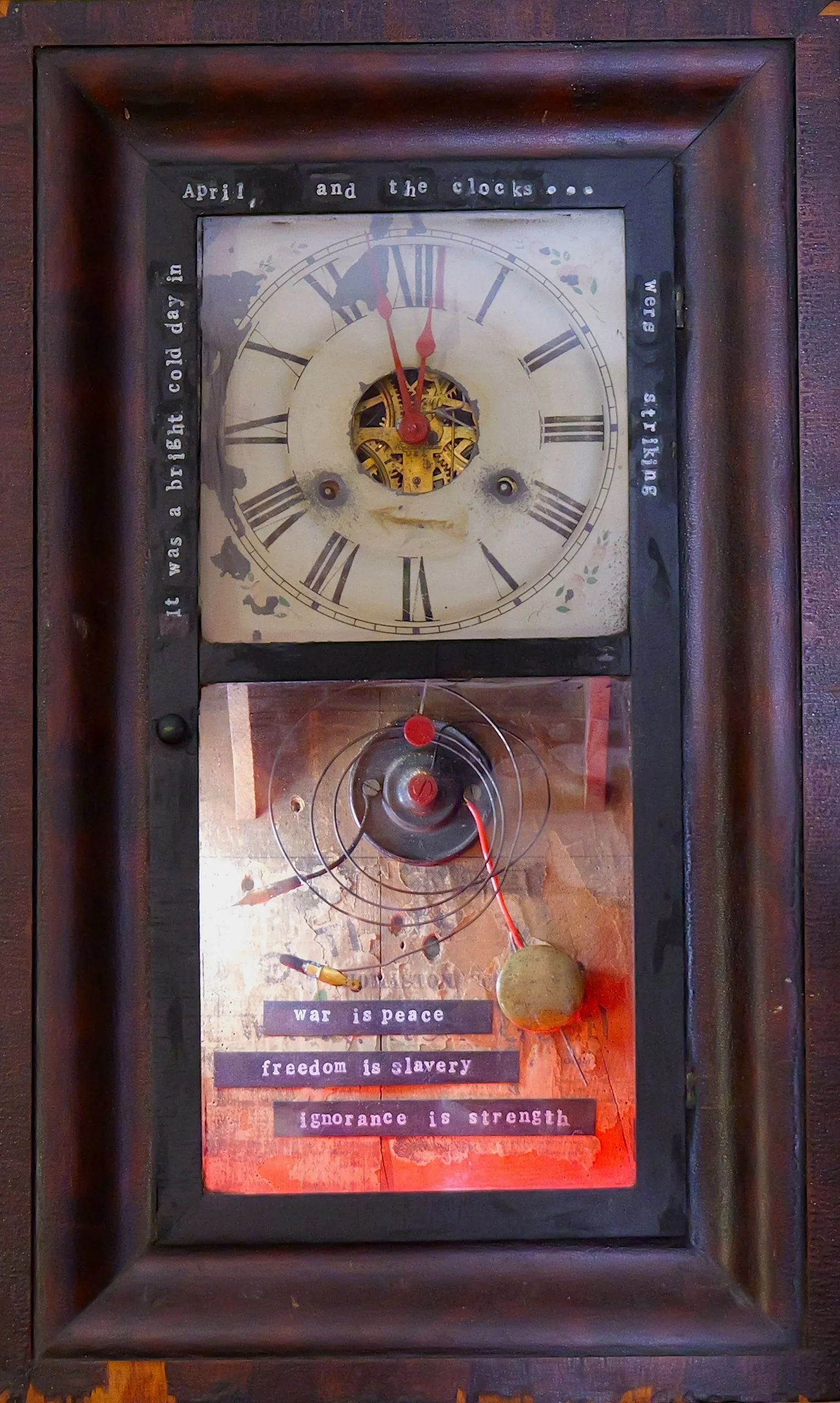 A red “hot” wire replaces the pendulum rod. The pendulum itself is frozen to the right. I left the faded words on the cabinet panel alone, as if they were a worn-out Bill of Rights, over which I taped Orwell’s doublespeak: “War is peace,” “Freedom is slavery,” and “Ignorance is strength” as if from a redacted or censored document. There are worm holes in the panel. I left them; they look like bullet-holes. The clock is lit from above below by sinister MAGA red lights.